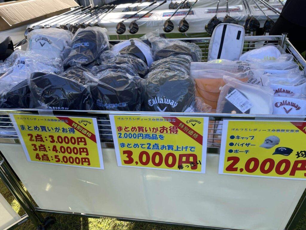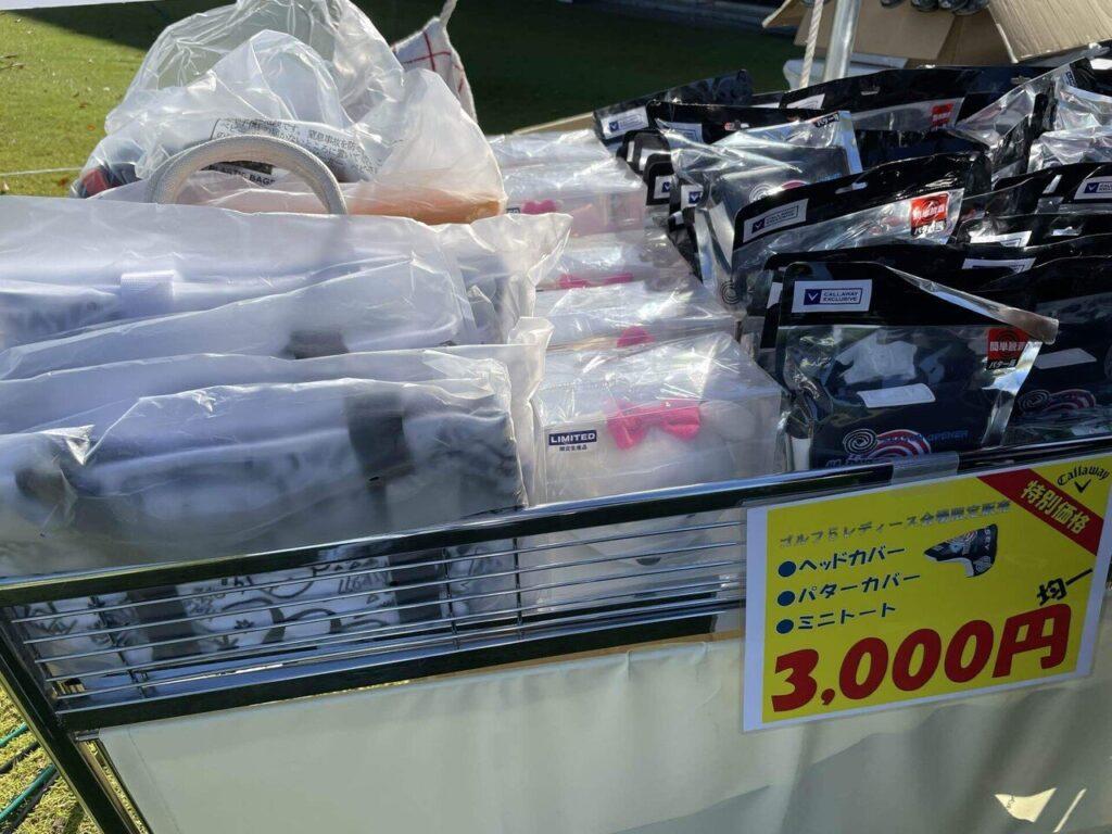 そしてこちらはキャロウェイの特設ブースで激安ワゴンセールです。ヘッドカバー、パターカバー、ミニトートが3,000円でした。オデッセイの限定デザインなどもあって8,000円くらいするものもあるので超お得です!!キャロウェイベアのヘッドカバーもあって買いたかったのですが、大きくて少し荷物になるので帰りに買おうと思ったら売り切れてました(涙)朝買えばよかったと後悔。。。