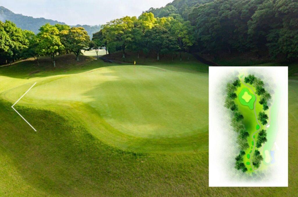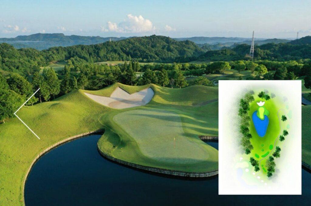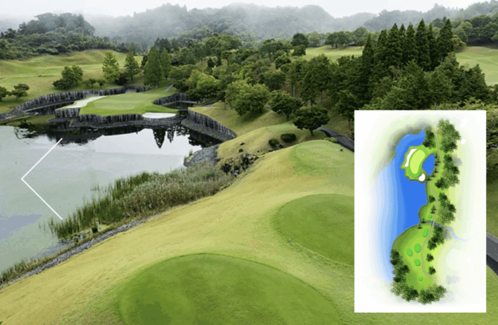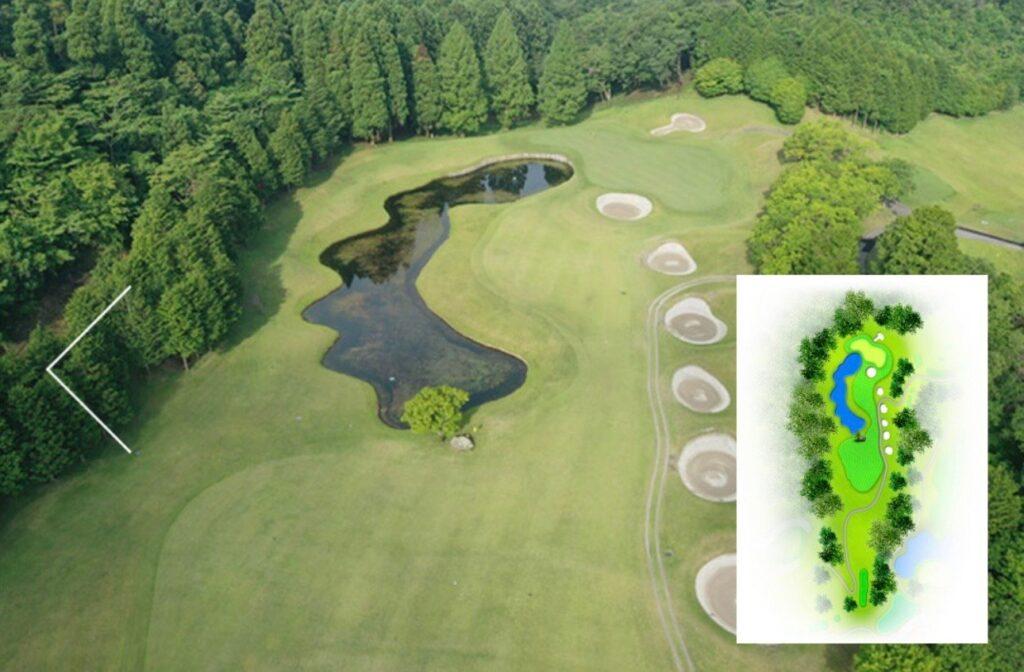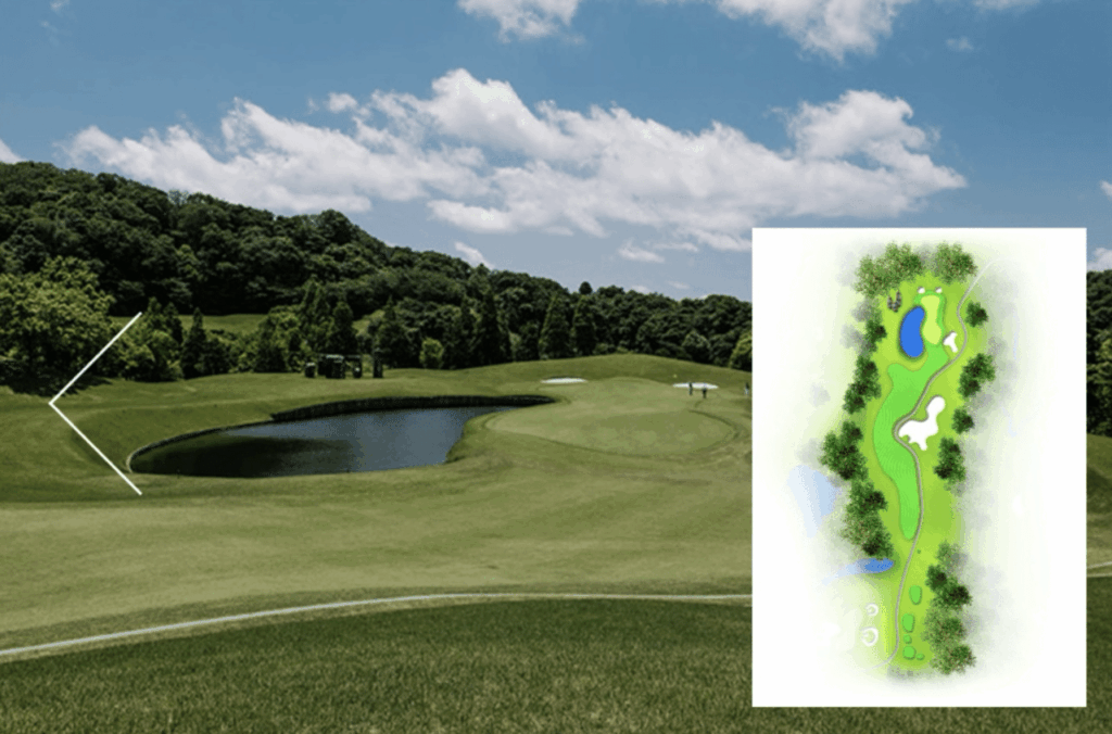 距離は短いが多彩な障害があるミドルホール。グリーンまで残り100ヤード以内は左側に池、右側に6つのバンカーがある為、ティショットの距離に十分注意し刻むのがベスト。