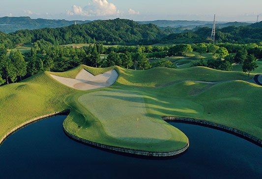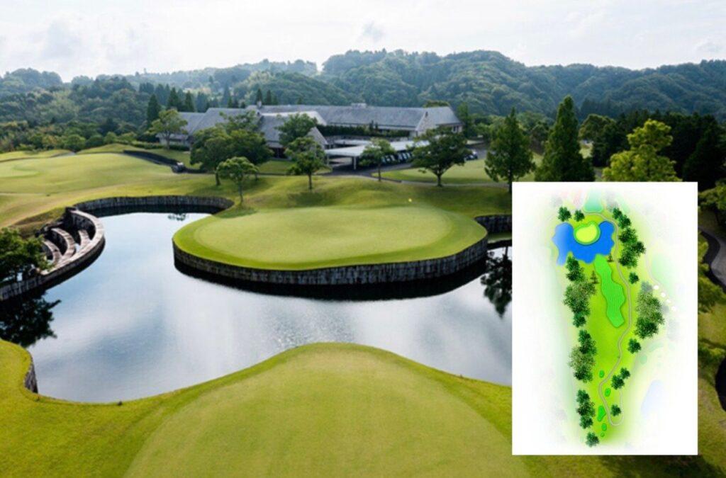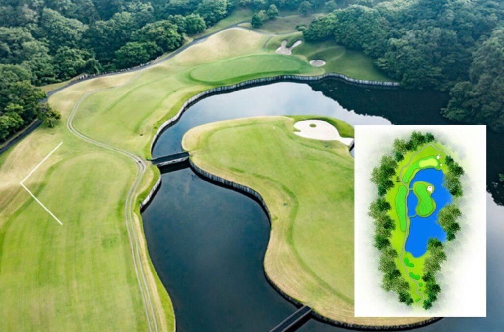 名物ホールの浮島フェアウェイ。左から地道に攻めるか、池越えでアイランドフェアウェイを狙うか2通りのルートがある。グリーン手前は池に傾斜しているので注意。