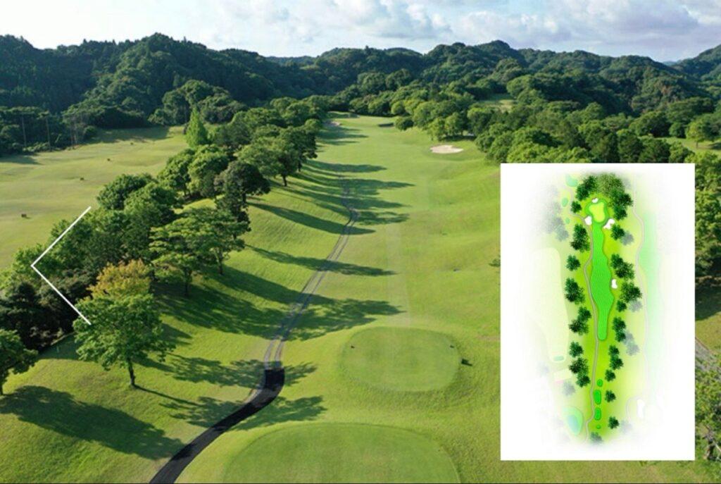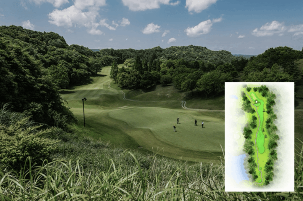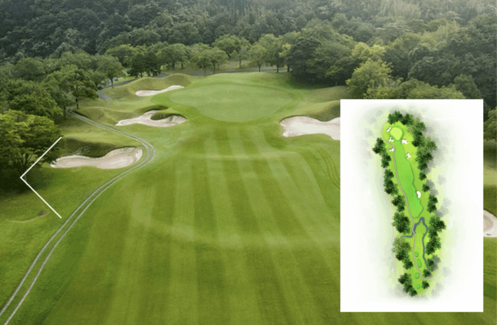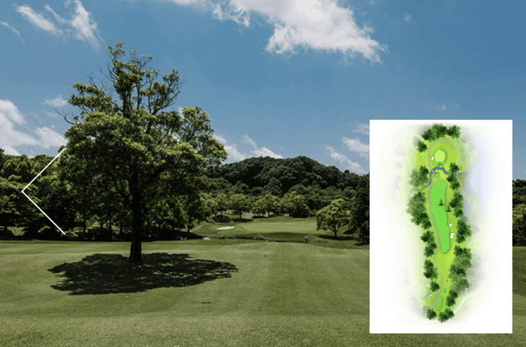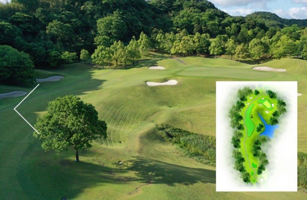 ティショットは右側からグリーン正面まで続いている谷(OB)を避け、正面の一本木の手前で刻むのがベスト。セカンドは谷越えになるので、少し大きめのクラブで無理をせずに。