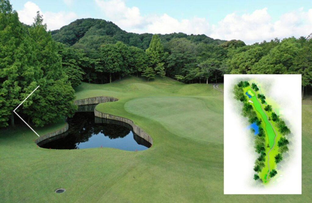 池越えで打ち下ろしのショートホール。打ち下ろしは10~15ヤード。