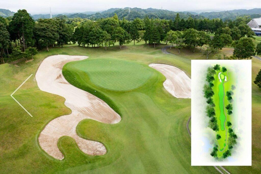 セカンド地点からグリーンまでは左足下がりとなり、グリーン手前の両サイドにはバンカーが配置されているので要注意。