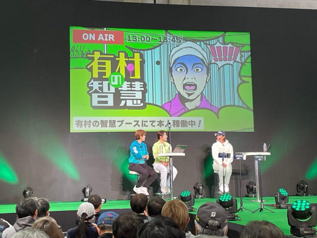 イベントステージでは、YouTubeチャンネル「有村の智慧」の公開収録をしていました。有村智恵プロと成田美々寿プロが、ゲストに若林舞衣子プロを迎え、若林舞衣子プロの「人生年表」について話していました。