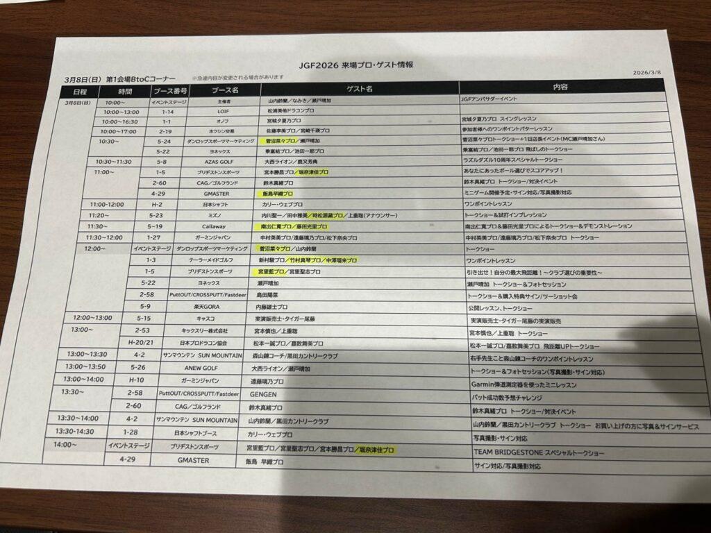 このスケジュールの合間に、各メーカーのブースを回って新作のクラブをチェックしたり、アンケートやSNSフォローでもらえるプレゼントをGETしたり、お昼を食べたり、UFOキャッチャーやガチャガチャのために並んだり、そしてもちろんJLPGAの開幕戦ダイキンオーキッドレディースのリーダーボードをチェックします。