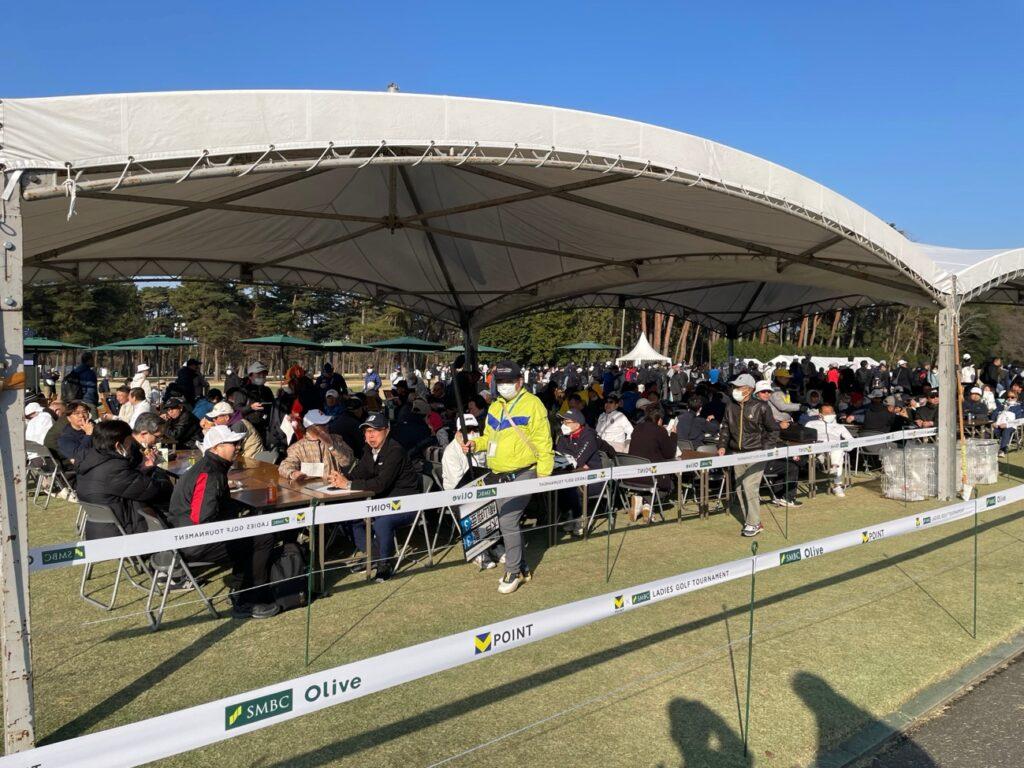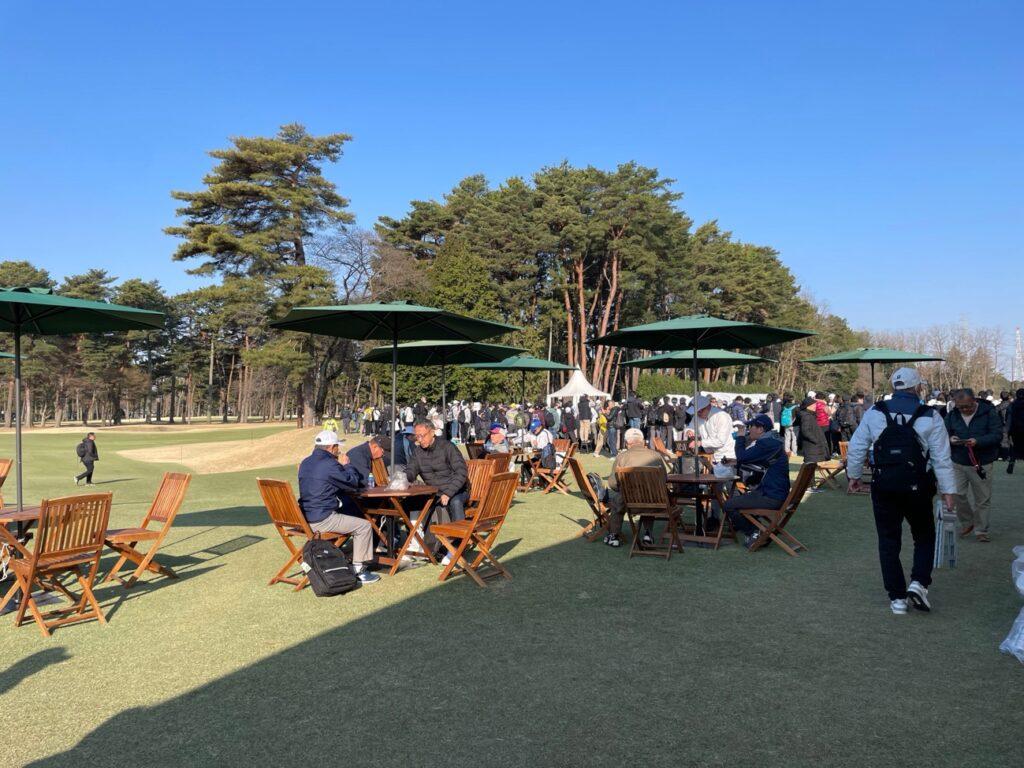 奥の練習場にはスタート前に多くのギャラリーが行列を作ります。